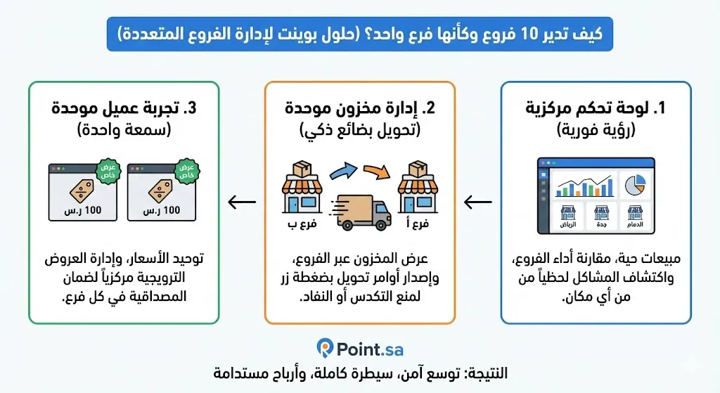 هل تخطط لفتح فرعك القادم قريباً؟ لا تكرر أخطاء الآخرين. ابدأ بداية صحيحة واكتشف كيف يمكن لحلول “بوينت” لإدارة الفروع المتعددة أن تجعل توسعك آمناً ومربحاً. [تواصل مع فريقنا لاستشارة مجانية حول خطة توسعك]