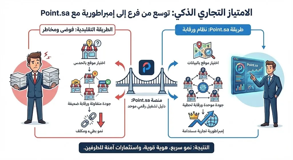 تبرز منصة بوينت (Point.sa) كأداة لا غنى عنها في رحلة التوسع بنظام الامتياز، حيث تعمل كقمرة قيادة مركزية تمنح صاحب العلامة التجارية رقابة كاملة على كافة الفروع الممنوحة. من خلال بوينت، يتم توحيد كافة العمليات التشغيلية رقمياً، مما يضمن التزام كافة الفروع بنفس المعايير في إدارة المخزون والمبيعات والخدمة. يوفر النظام تقارير مقارنة لحظية توضح أداء كل فرع بدقة، مما يسمح باكتشاف مواطن الخلل في أي مكان واتخاذ إجراءات تصحيحية فورية. بوينت لا تحمي فقط جودة علامتك التجارية، بل تحمي أيضاً استثمارات ممنوحي الامتياز عبر تزويدهم بأدوات تحليلية متقدمة تساعدهم على تحسين أرباحهم، مما يخلق علاقة رابحة للطرفين مبنية على الشفافية الرقمية والنمو المشترك.