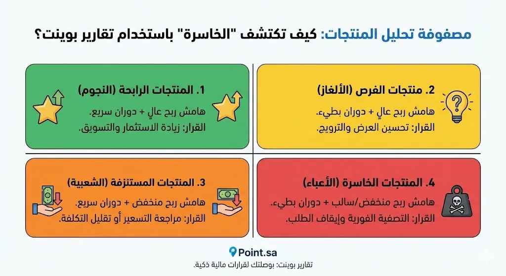 قد يبدو الأمر متناقضاً، ولكن المنتج الأكثر طلباً قد يكون هو السبب الأول في ضعف سيولتك. هناك ما يسمى بـ “المنتجات المستنزفة” التي تبيع منها كميات كبيرة ولكن بهامش ربح ضئيل جداً. باستخدام تقارير “بوينت”، يمكنك ربط تكاليف الشراء المباشرة والمصاريف الجانبية بكل صنف، لتعطيك نسبة الربح المئوية الدقيقة لكل وحدة مباعة، مما يكشف لك إذا كان هذا المنتج يساهم في نموك أم أنه مجرد “موظف لا يدفع إيجاره”.